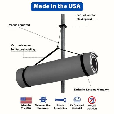 Smart hoisting system designed for easy, secure storage. Featuring a custom harness, pulley, and Neat Cleat Bloxx, this space-saving setup lifts your mat out of the way while keeping it accessible.